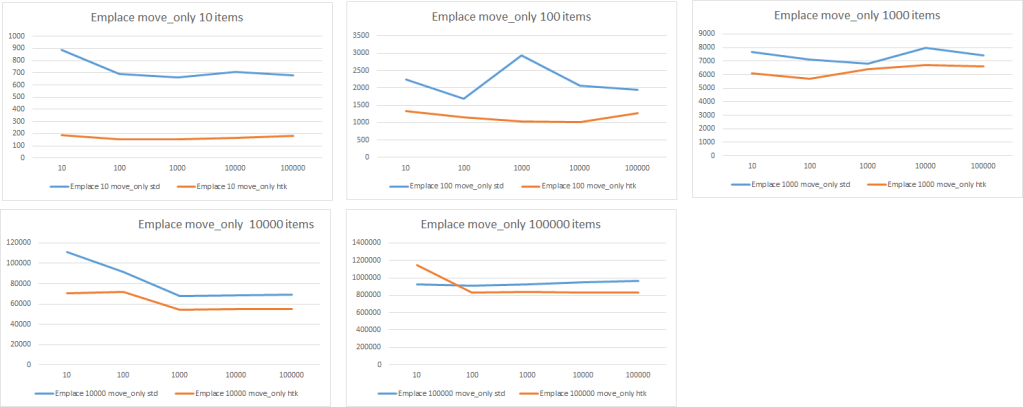 - Emplace 10, 100, 1 000, 10 000, 100 000, 1 000 000 struct w/ move ctor.