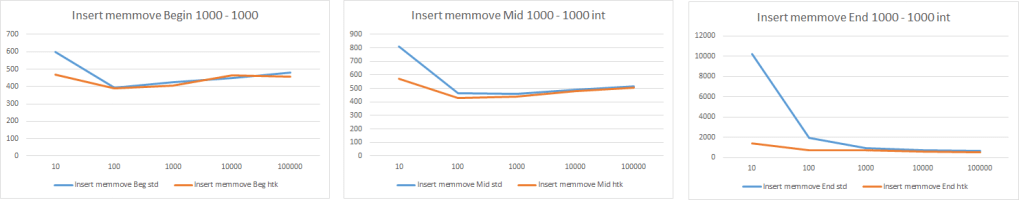 Overall — I’d say this is a blow out, the std vector is about 5x faster in all cases than our htk vector. So then we ask ourselves, why? Well, the answer lies back with what we did for emplace, and what we didn’t do for insert. Well, kind of. With the insert, when we need to grow if the original items, and they’re trivial items, we can just use memmove to very quickly move the contiguous data from one area of memory to another. Keeping in mind, this is trivial data which is what allows us to just copy the bytes. This definitely optimized our growth code for trivial types. However, when we implemented insert we used this code: