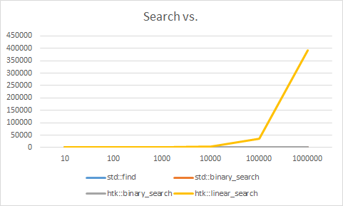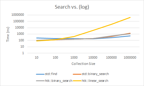 To close off this post, my plan was to illustrate the magic of the binary_search over the plain old linear search. However, like always, color me surprised. I went off an used the chronograph library to time the different search functions. I wanted to test std::find, std::binary_search, and htk::binary_search (recursive) to see how they fair across a vector of integers. So the test was as follows.