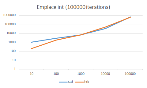 - Emplace 10, 100, 1 000, 10 000, 100 000, 1 000 000 int values.