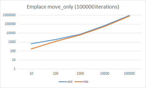 In two of the cases emplace 1000 and 10000, we didn’t actually win. If you look at the 100000 iteration trials for both tests, the timing was almost identical. So likely, at best for two of the cases we’re equal, which makes sense. To illustrate this further we’ll take the 100000 iteration trials, for each test 10 items, 100, 1000, 10000, 100000 items and graph that.